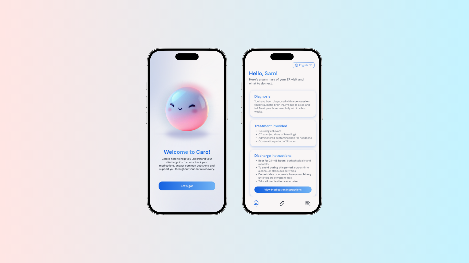 Discharge instructions often fail patients with low health literacy or language barriers. CARO reframes information delivery through visual hierarchy and interaction design, ensuring essential next steps are understandable without feeling clinical or intimidating.